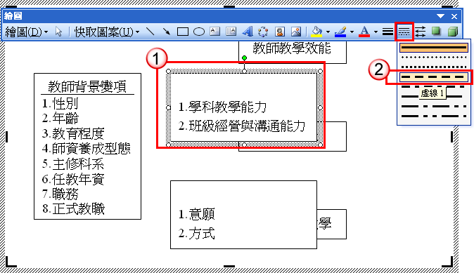 再複製二個【教師教學效能】的矩形物件,用來說明【教師教學效能】的二個向度(1.學科教學能力,2.班級經營與溝通能力)和【資迅融入教學】的二個向度(1.意願,2.方式)。 | |